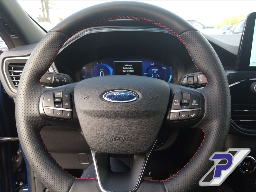 Ambiente-Beleuchtung vorn (LED) Anti-Blockier-System (ABS) Antischlupfregelung (ASR) Antriebsart: Frontantrieb Außenspiegel elektr. anklappbar Außenspiegel elektr. verstell- und heizbar BORDCOMPUTER Dachreling schwarz Dachspoiler Wagenfarbe Doppelendrohr Auspuffanlage Elektron. Stabilitäts-Programm (ESP) Fahrassistenz-System: Notbrems-Assistent Fahrassistenz-System: Post-Collision-System Fahrassistenz-System: Spurhalteassistent Fensterheber elektrisch vorn + hinten mit Komfortschließung FordPass Connect inkl. eCall Fußmatten ST-Design Gepäckraumabdeckung / Rollo Getriebe Automatik stufenlos - ECVT Heckleuchten LED ISOFIX-Aufnahmen für Kindersitz Induktionsladeschale für mobile Endgeräte Innenspiegel mit Abblendautomatik Klimaautomatik 2-Zonen Kombiinstrument Digitalanzeige 12,3 Zoll LM-Felgen Lackierung Blazer-Blau uni Ladekabel mit Schukostecker Lenkrad (Sport/Leder, ST) Lenksäule (Lenkrad) höhen-/längsverstellbar My Key (2. Fahrzeugschlüssel programmierbar) Parkpilotsystem vorn und hinten Reifen-Reparaturkit Reifendruck-Kontrollsystem Rückfahrkamera Rücksitzlehne geteilt Rücksitzlehne klappbar Schadstoffarm nach Abgasnorm Euro 6d Schalt-/Wählhebelgriff Aluminium Scheibenrahmen schwarz Scheibenwischer mit Regensensor Scheinwerfer mit Ausschaltverzögerung Scheinwerfer-Assistent mit Tag-/Nachtsensor Servolenkung elektrisch Sitzheizung vorn Sonnenblende rechts mit Spiegel (beleuchtet) Spezialausführung 2 Sport-Fahrwerk Sportsitze Zentralverriegelung mit Fernbedienung